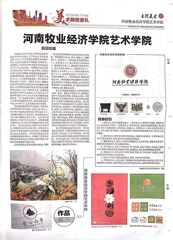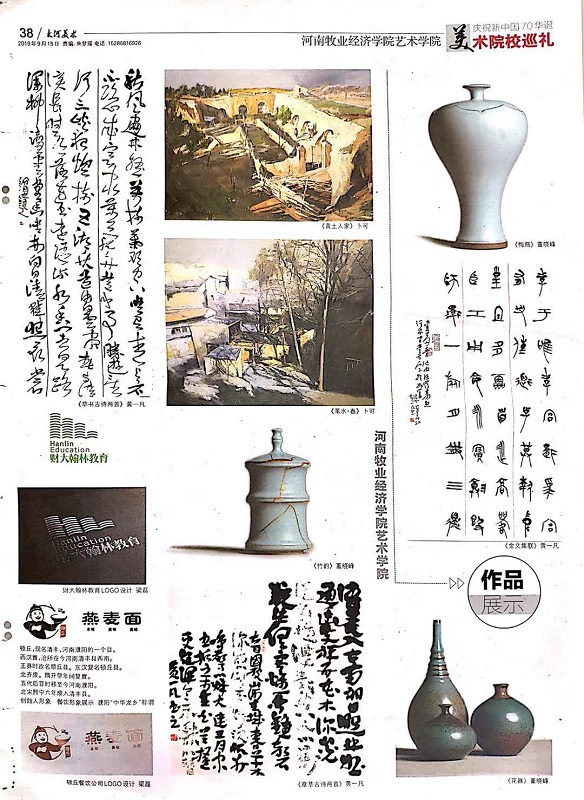 近日,《大河美术“美术设计学院特刊”》对我校beat365英国官网网站及教师作品进行了专版介绍,此次特刊一共报道省内十二所本科院校beat365英国官网网站的办学情况和师生作品。我校beat365英国官网网站简介被大量篇幅报道,其中,大师董晓峰代表作品陶瓷,卜可的绘画作品、粱磊和卞卡的设计作品以及黄一凡的书法作品也被一一刊登展示。