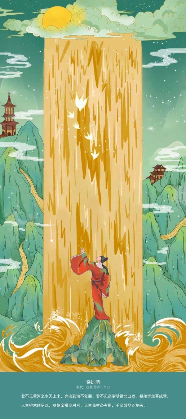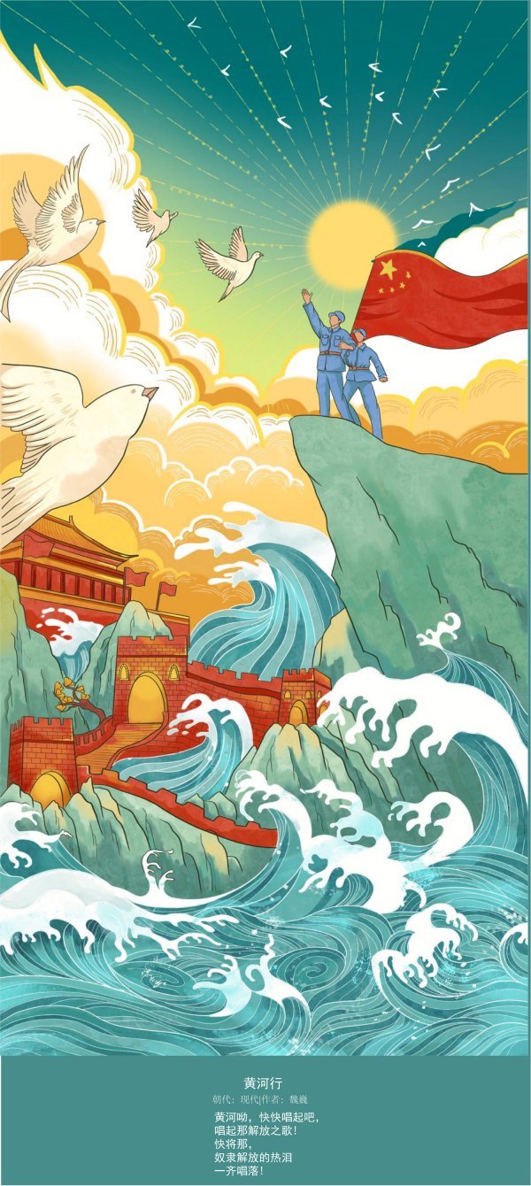 这组插画借鉴国画传统手绘线描描绘黄河的波澜壮阔,用造型装饰表现和现代电脑手绘结合,同时借鉴宋代画家王希孟的《千里江山图》里的青绿、赭黄为主色调,完美体现传统与现代绘画技艺、现实与浪漫主义风格的融合。这组插画不光选取了大家熟悉的唐代诗人李白的《将进酒》《西岳云台歌送丹丘子 》、王之涣的《凉州词》《登鹳雀楼》、唐代诗人柳中庸的《征人怨》,还有大家不太熟悉的元代元好问的《水调歌头·赋三门津》、现代作家魏巍的《黄河行》、现代不知作者姓名的现代诗《小浪底》等诗歌作品,不仅表现了古代黄河气吞山河的气势磅礴,还表现了现代黄河儿女改天换地、黄河两岸经济繁荣、安居乐业的场景,昂扬着中华民族生生不息、再现从古到今黄河文化的华彩篇章。同时也展现了beat365英国官网网站beat365英国官网网站在贯彻落实习近平总书记做出要“扎实推进黄河流域生态保护和高质量发展”的重要指示,不断提升专业教学质量,贴合时代精神、传承黄河文化创新发展的教学成果,更展现了我校师生在疫情防控常态化学习工作中,传承中国文化、奋发进取的精神风貌。