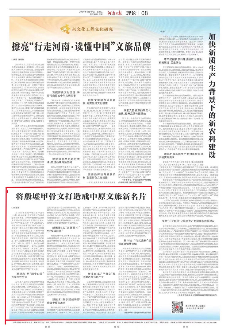 田志涌撰写的理论研究文章《将殷墟甲骨文打造成中原文旅新名片》在《河南日报》(理论版)刊发。文章从新理念:从“阳春白雪”走向百姓生活、新场景:从“满天星斗”到“穿珠成链”、新技术:数字赋能讲好殷墟甲骨文故事、新业态:以“甲骨文”经济激活多元化产业、新体验:“花式宠粉”提供足够情绪价值五个方面阐述了将殷墟甲骨文打造成中原文旅新名片的路径。