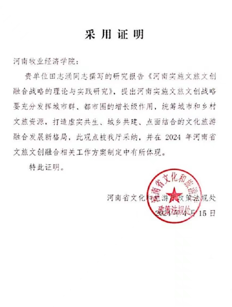 河南兴文化工程是《河南省“十四五”时期文化发展规划》《河南省“十四五”时期哲学社会科学发展规划》的重点工作,由田志涌主持的河南省哲学社会科学规划项目《河南实施文旅文创融合战略的理论与实践研究》,提出河南实施文旅文创战略要充分发挥城市群、都市圈的增长级作用,统筹城市和乡村文旅资源,打造虚实共生、城乡共建、点面结合的文化旅游融合发展新格局的观点被河南省文化旅游厅政策法规处采纳,并在2024年河南省文旅文创融合相关工作方案制定中有所体现。