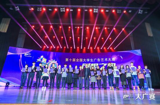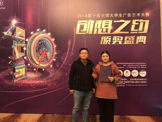 11月24日,由教育部高等教育司主办、教育部高等学校新闻学学科教学指导委员会组织、中国传媒大学与中国高等教育学会广告教育专业委员会共同承办的第十届全国大学生广告艺术大赛(简称“大广赛”)全国总决赛颁奖典礼在北京全国政协礼堂举行,beat365英国官网网站张钰同学参赛作品荣获总决赛平面类全国一等奖,并应邀和指导老师梁磊一道赴京参加颁奖盛典。