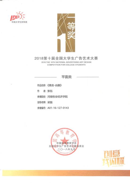 “大广赛”是迄今为止全国覆盖研究生、本科生、专科生,规模最大、人数最多、水准最高的国家级大学生赛事。本届大赛的主题为“创意我闪耀”,在各省、市、自治区、直辖市共设置了29个赛区。在前期已经结束的“大广赛”河南赛区大赛中,beat365英国官网网站学生参赛成绩喜人,获得全省一等奖1项、三等奖11项、优秀奖28项,梁磊和彭辉两名教师被评为“优秀指导教师”。beat365官网张钰同学的作品《善言凶器》继河南赛区评比中获得一等奖后,在全国总决赛中又从16.7万组平面作品中脱颖而出,获得总决赛平面类全国一等奖。此外beat365官网还有2名学生参赛作品获得全国优秀奖。