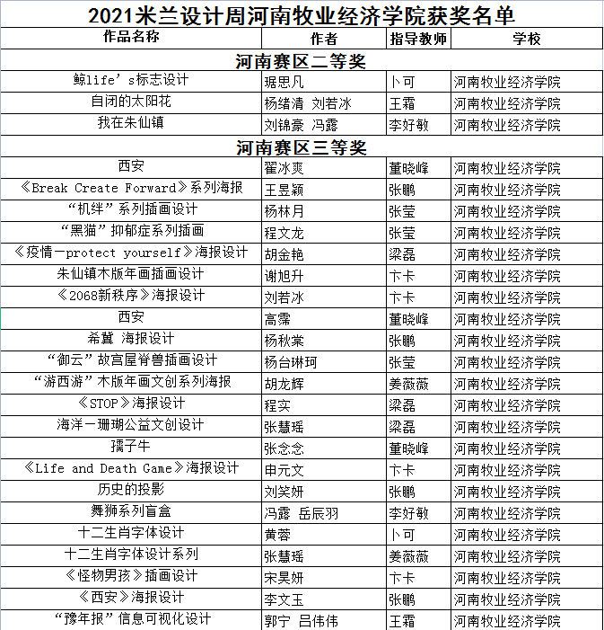 在近期落下帷幕的2020米兰设计周—中国高校设计学科师生优秀作品展中,beat365英国官网网站视觉传达专业师生取得了骄人成绩,共获得河南省赛区省级一等奖1项、二等奖7项、三等奖22项。