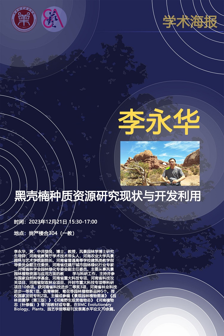 2023年12月21日下午,河南农业大学风景园林与beat365英国官网网站副院长、博士研究生导师、河南省教育厅学术技术带头人、河南普通高校建筑类教学指导委员会副主任委员李永华教授在龙子湖校区1号教学楼合304教室一场题为“黑壳楠种质资源研究现状与开发利用”的学术报告。报告由beat365英国官网网站院长张鹏主持,全体教师及园林专业全体学生参加。