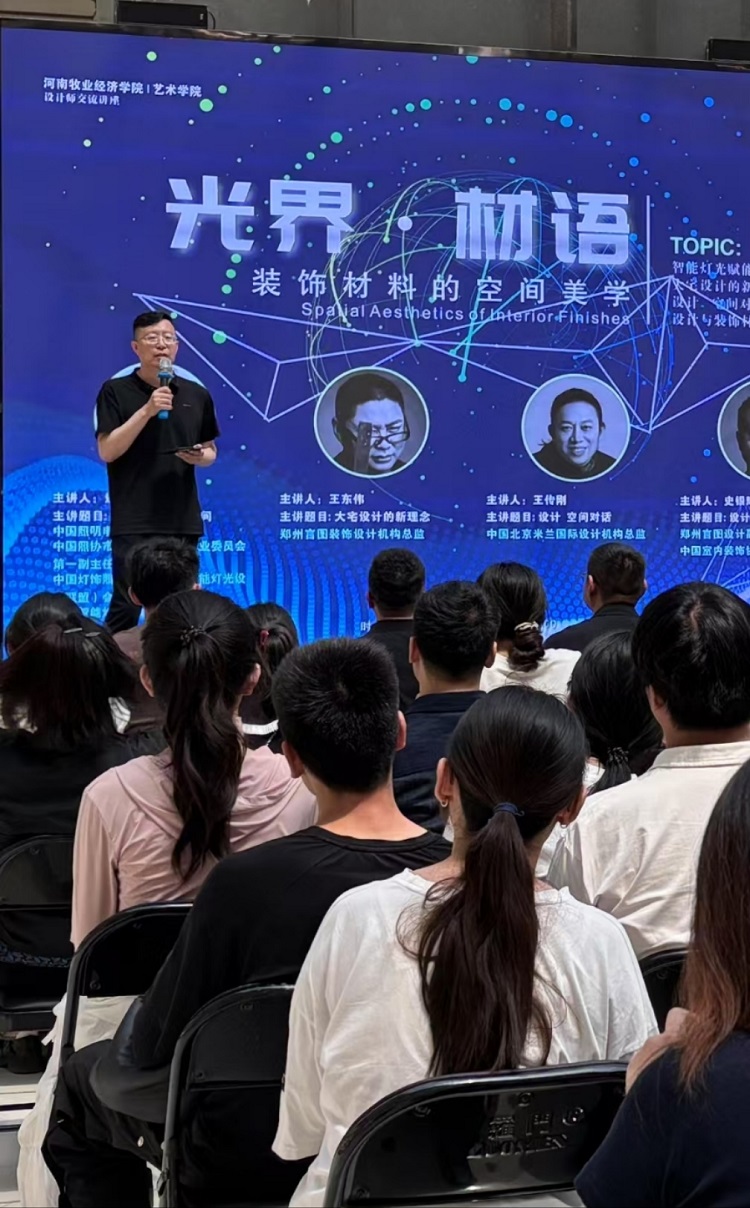5月21日下午,beat365英国官网网站环境设计专业23级全体师生赴华丰灯饰界,开展《装饰构造与材料》课程实践讲座活动。本次活动以“光界材语——装饰材料的空间美学”为主题,特邀华丽智能灯光董事长连志刚、郑州言图装饰设计总监王东伟、中国北京米兰国际设计机构总监王传刚、郑州言图设计副总监史银辉四位行业专家主讲,环境设计专业23级全体师生共同参加了此次实践活动。