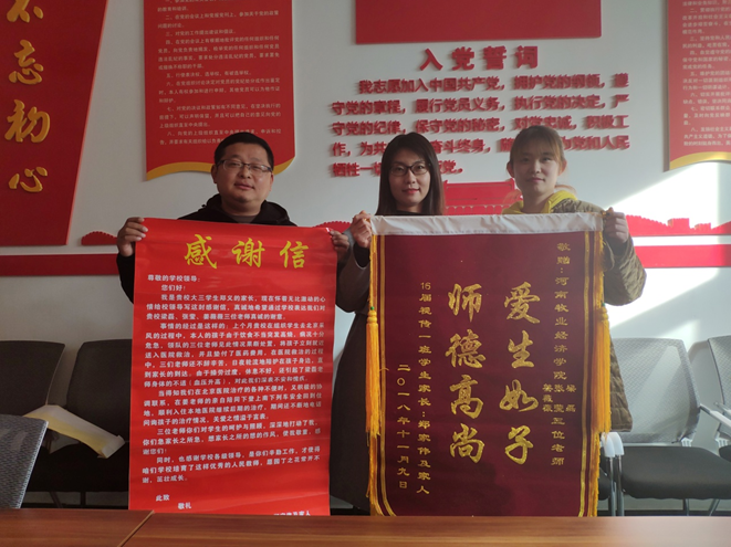 “爱生如子,师德高尚”。 不仅是对学校的肯定和鼓励,更是一种鞭策、激励。11月12号上午,两位心情激动的家长把锦旗和感谢信交到beat365英国官网网站的领导手中,感谢视觉传达教研室姜薇薇、张莹、梁磊三位老师的爱心关怀。