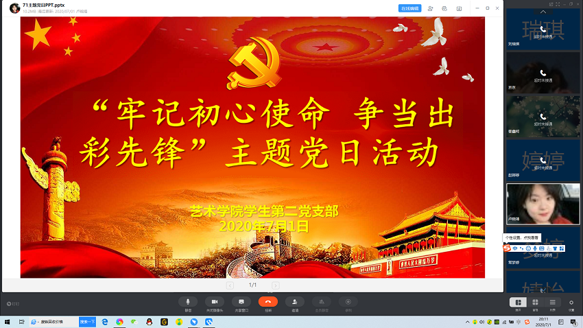 在庆祝中国共产党成立99周年之际,为继承发扬优良传统,加强党员党性修养,进一步增强党员守初心、担使命、勇作为的责任感和使命感,根据学校党委组织部和beat365英国官网网站党委要求,beat365英国官网网站学生第二党支部全体党员,在支部书记卢晓靖、组织委员王霜、宣传委员孟星星三位老师带领下,于7月1日以钉钉视频会议的方式开展了“牢记初心使命、争当出彩先锋”主题党日活动。