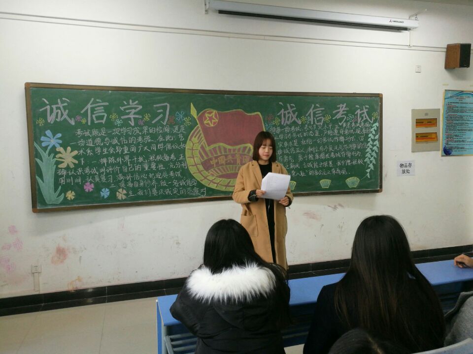 在本学期的最后一次团课中,让同学们严守期末考试纪律,做诚信的人。同时树立道德之风,弘扬诚信做人的道德本分。分数固然重要,但是健康人格的塑造更重要。通过各个班级的班长和团支书再次提醒,严守考试纪律。有借助视频向同学讲解着大学考试与高中考试的区别,提醒大学诚信考试的重要性。要求同学们做一个诚信的人,不应为几分或者几十分而丢失自己的人格。同样,各个班级的学习委员要求班级同学认真看学生手册,也给予同学们一定的思考时间。重点再次强调要严明考纪,打造一个学风良好的环境。