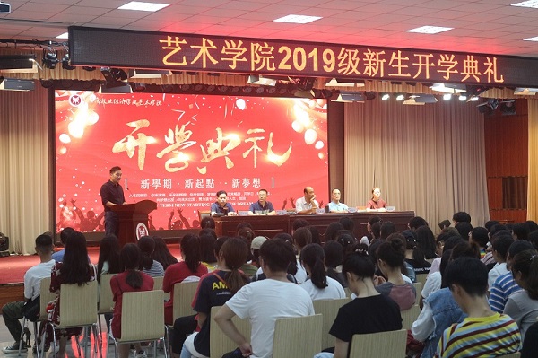 典礼在庄严地国歌声中拉开序幕。首先,典礼由张鹏院长致辞,张院长向同学们介绍了学校的基本情况和学院的专业设置,并向新生寄予三点希望:回归常识,树立人生新目标;学会自我管理;学会包容,快乐成长。其后教师代表张莹老师发言,张老师希望同学们在大学生活中能够提高修养,培养批判意识并学会感恩。接下来,优秀校友代表2000级室内设计专业毕业生、河南瑞隆建设工程有限公司李冰阳董事长,用其亲身工作和创业经历,启迪同学们树立远大理想,务实奋斗,实现自己的人生价值。之后,由学生代表16级环艺四班王曼发言,王曼学姐用自己的在校经历,建议新生们树立一个目标,保持对工作和生活的热情。随后,新生代表19级环艺三班俞锦麟代表所有新生表达了对大学和以后生活的向往。最后,团总支副书记吕影带领全体新生进行宣誓,新生慷慨激昂的语气,表现出他们对大学的憧憬和提高自身的决心。