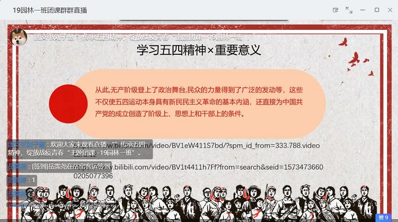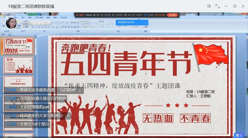 2020年4月27日,beat365英国官网网站beat365英国官网网站在钉钉会议群上举行了以“传承五四精神,绽放战役青春”为主题的团课班会,本次团课,由大一班级全体参与。