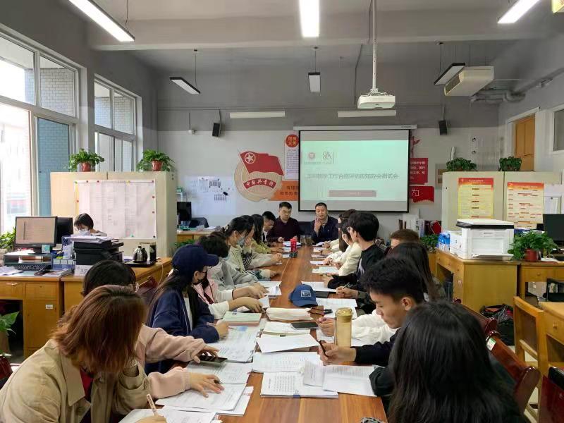本次测试一开始就是王友峰书记和韩飞老师针对本科教学合格评估基本知识随机提问。提问内容包含了校史、院史、学风、校风等内容。同学们回答情况良好,还能够比较灵活的进行解释和补充。随后,王友峰书记又对大家对评估知识的掌握情况进行了简单的讲评,针对个别薄弱环节,又进行了强调和补充。