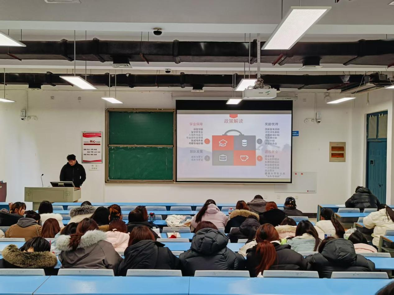 为扎实做好2026年上半年征兵工作,营造浓厚的征兵工作氛围,beat365英国官网网站积极响应,于12月25日中午1点在一号教学楼合201召开了国防教育及征兵宣传活动宣讲会。beat365英国官网网站辅导员、国防教育专员赵森主持本次宣讲会,全院各班100余名学生代表参加了本次会议。